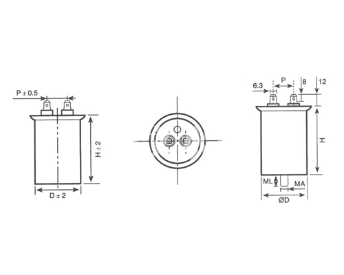 Outline drawing of CBB65 metallized polypropylene film AC motor capacitor